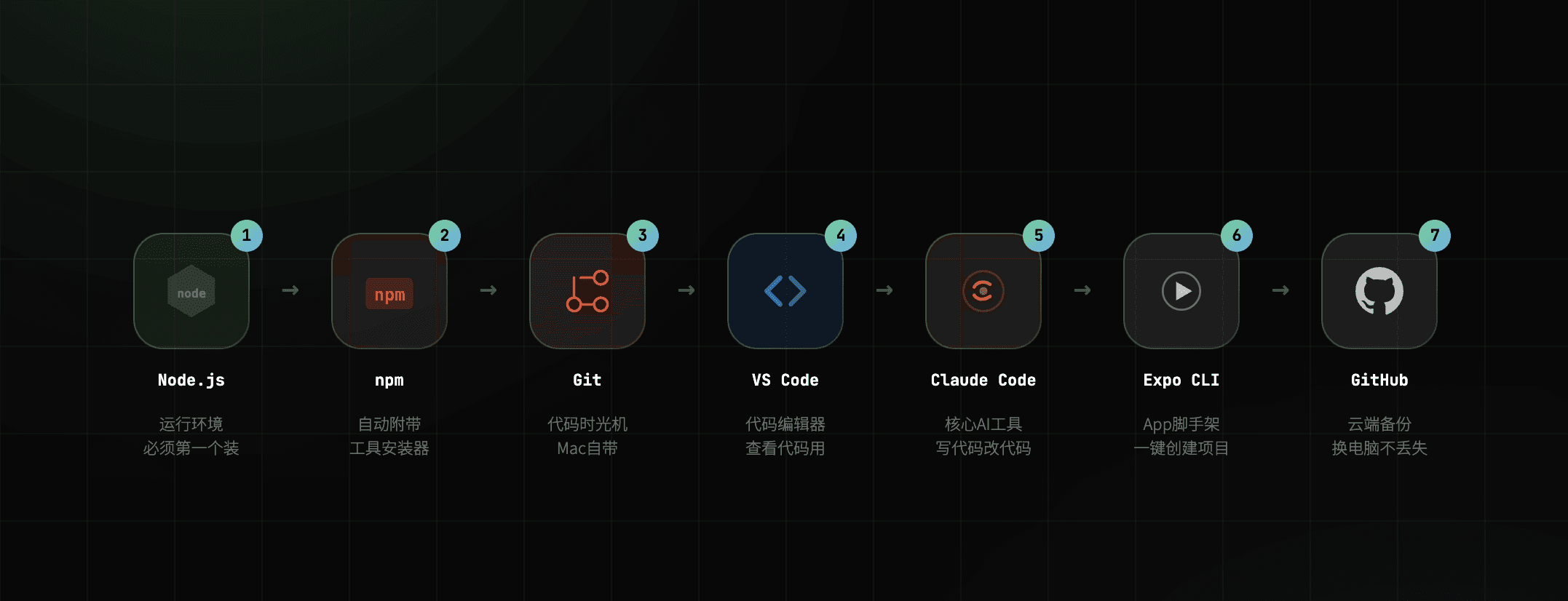 1. Node.js — The engine that powers everything. All developer tools depend on it, so this goes first. Nothing works without it. → https://nodejs.org